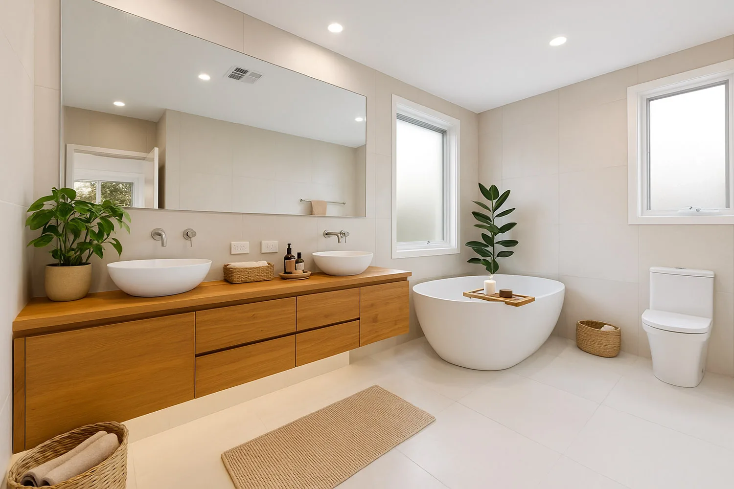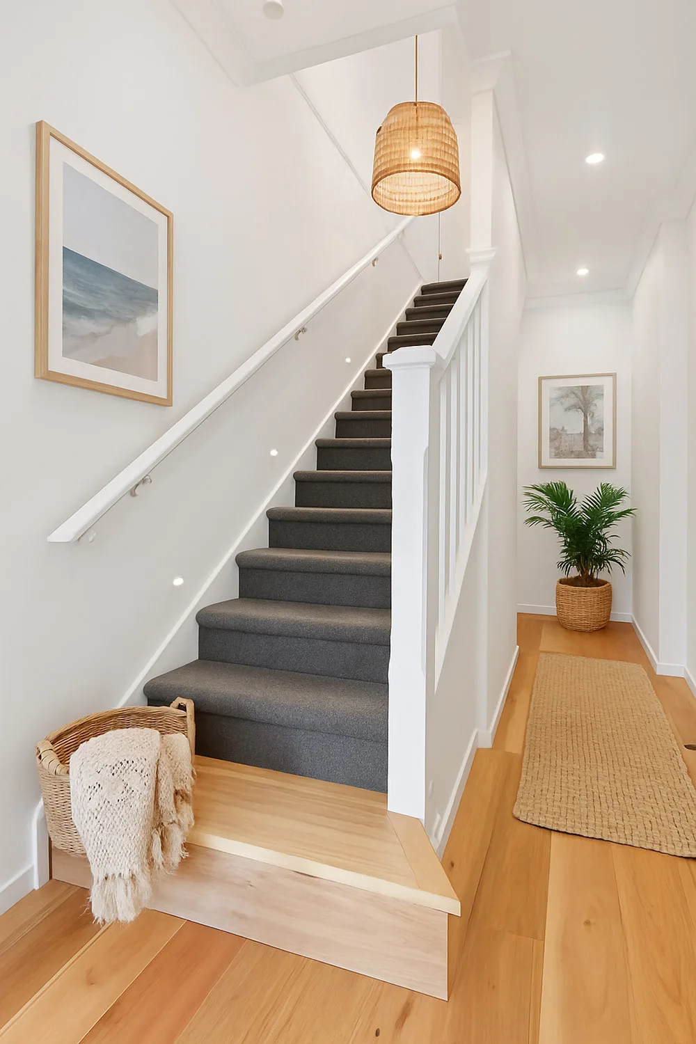 To create a relaxing ambience, we added LED downlights throughout the house, as well as custom lighting to the staircase and vanity units.