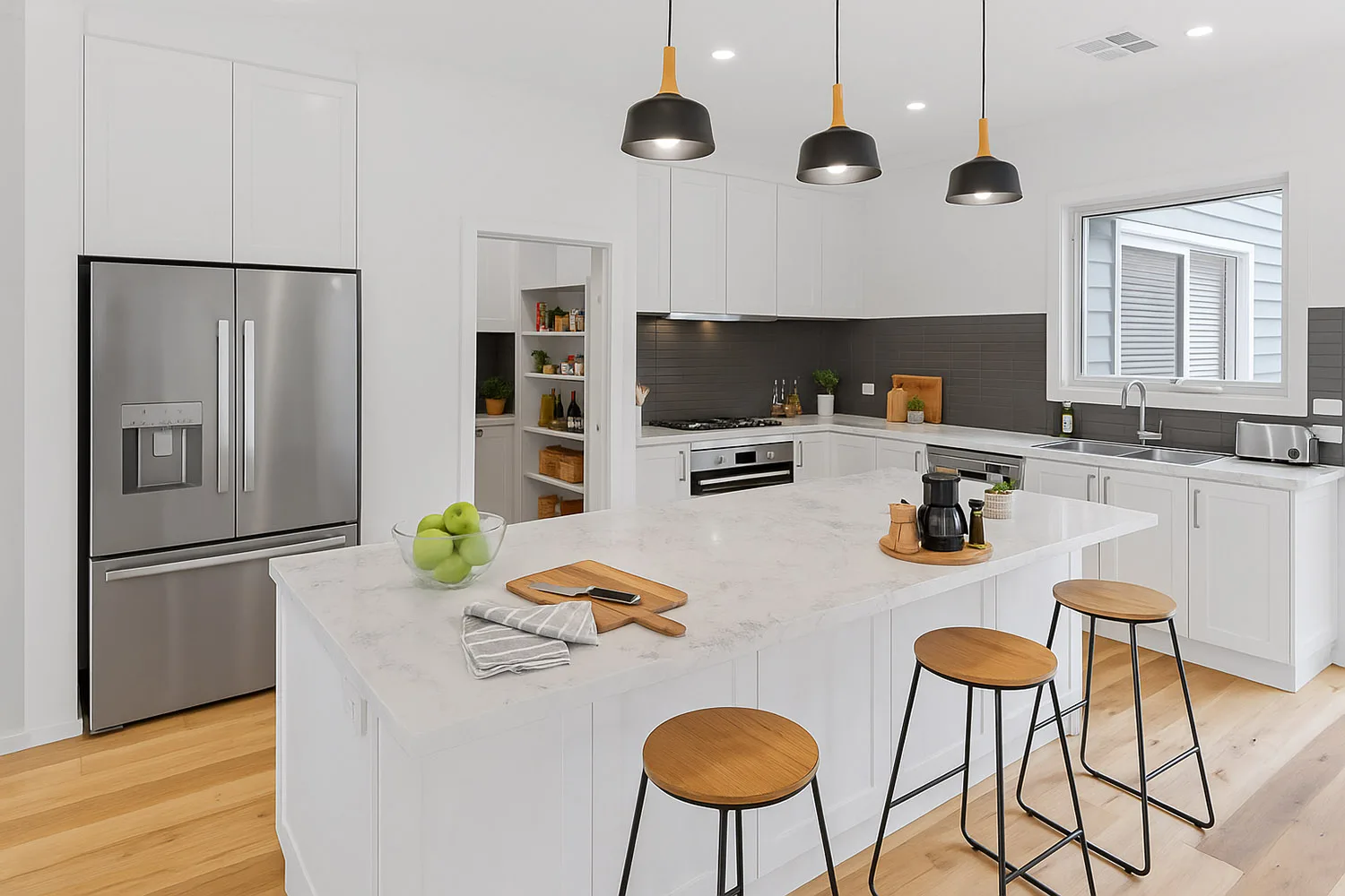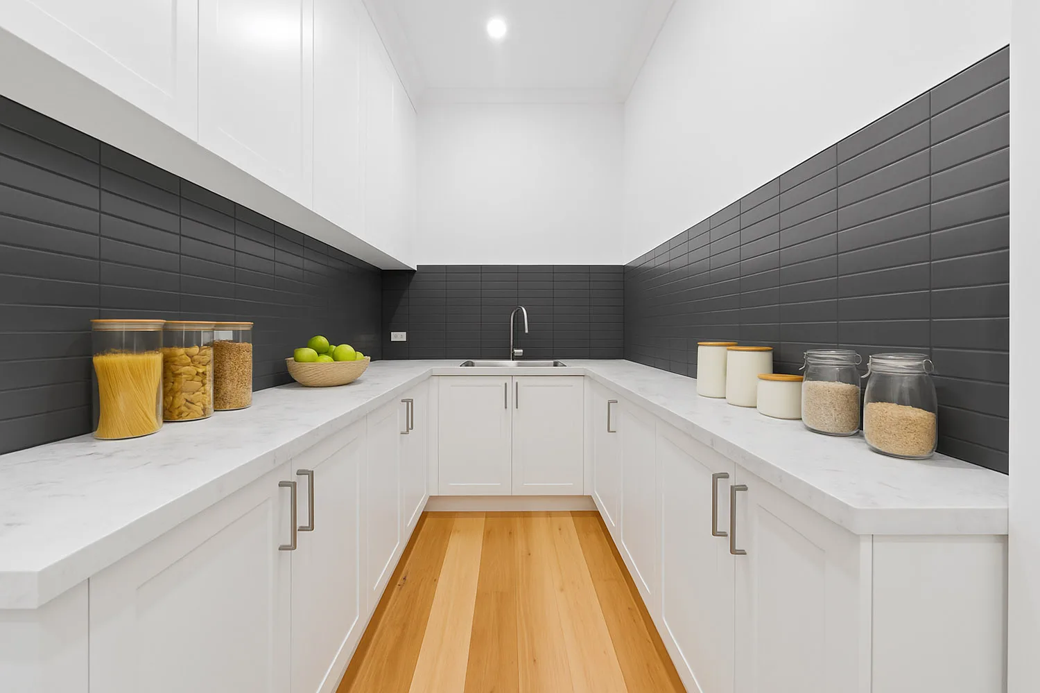The open plan kitchen diner is the heart of the home, and with double width sliding doors along the east and west walls, the room is flooded with light all day long. We opted for handle less top level cupboards to give the kitchen a very natural minimalistic flow, and with wall to wall shelving available in the adjoining utility and butler’s pantry, the stone bench tops in the main kitchen space can be kept clear of clutter and appliances.