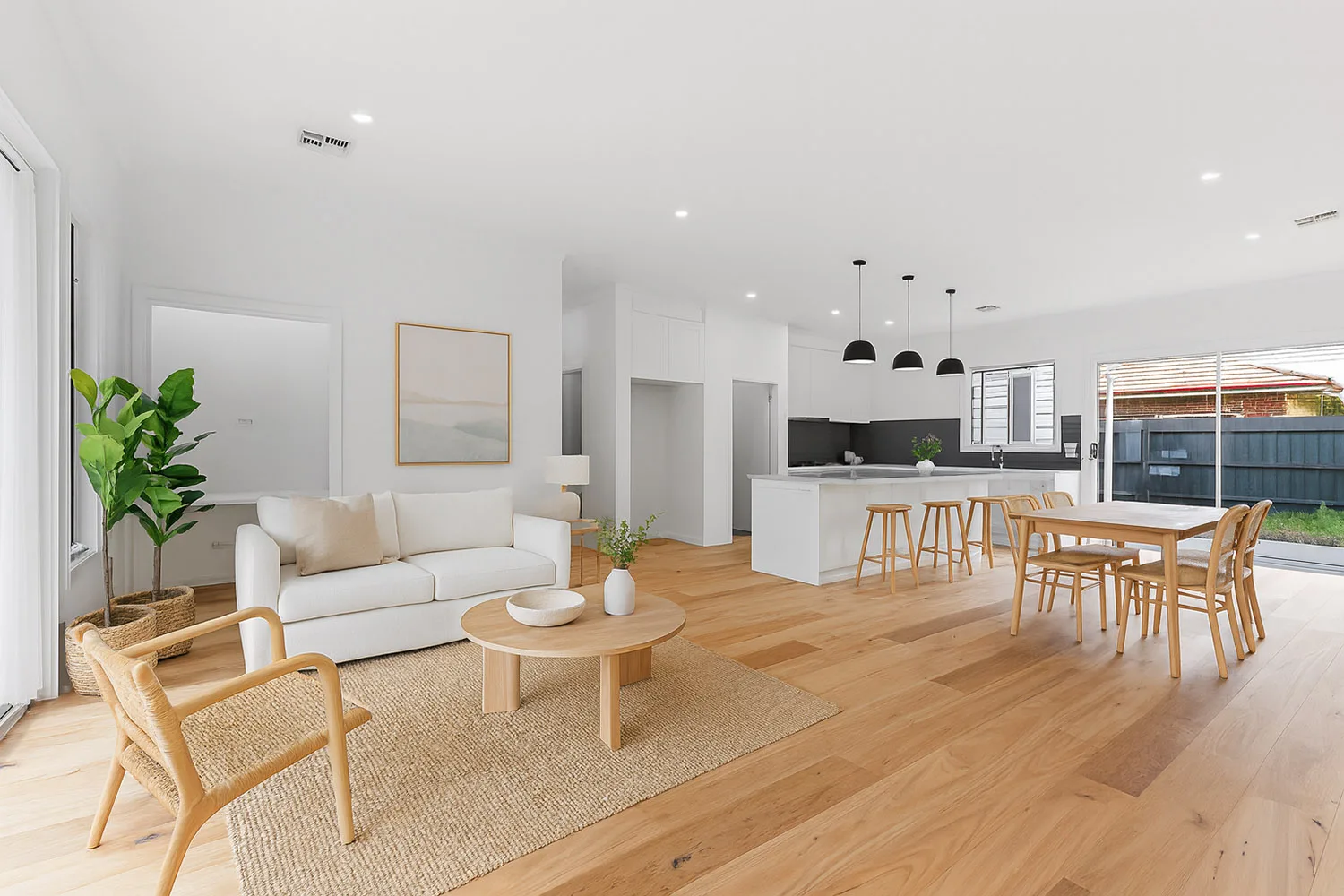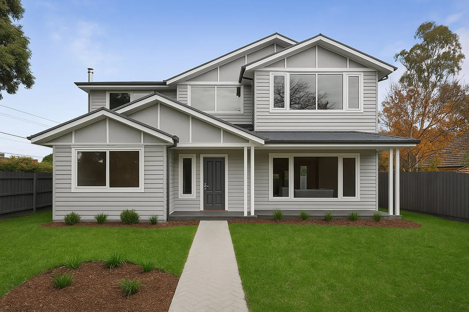 To the exterior of the house, we gave the alfresco added character by leaving the rafters exposed. The house is clad in weatherboard veneer for durability, and to complement the eye-catching property, we installed coloured concrete paving and new fencing around the perimeter.