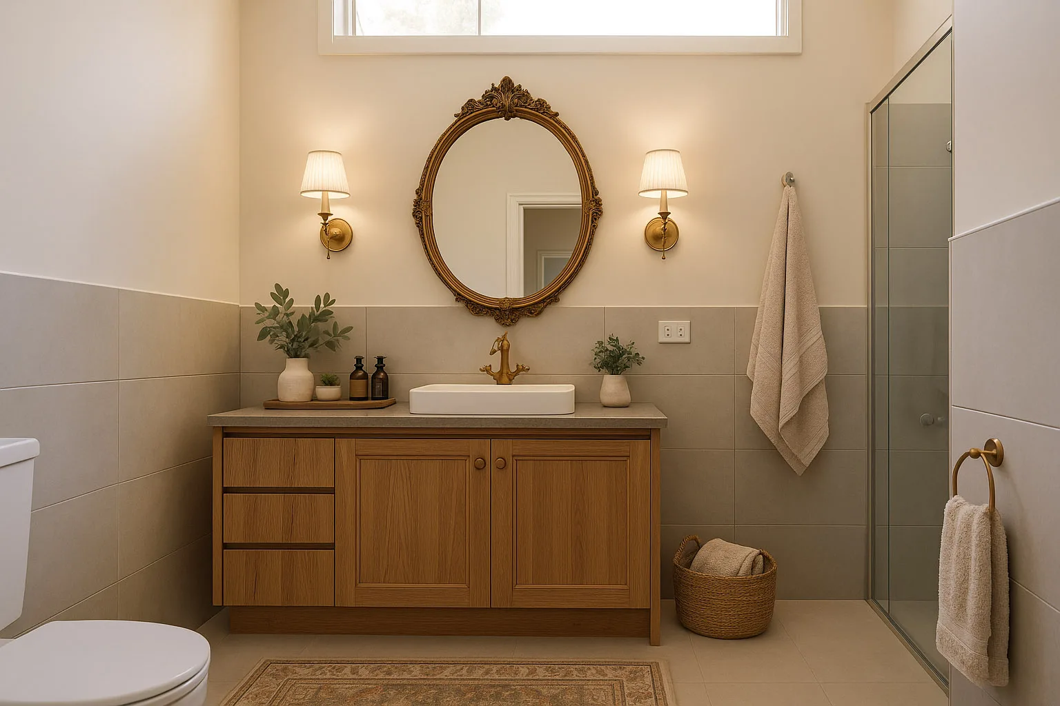 To make the best use of space without the visual clutter of multiple large appliances, we installed a European style Laundry in the bathroom, which showcases imported tiles that were specifically selected by the owner.